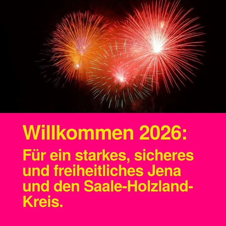 Zum Jahreswechsel wünschen wir allen Bürgern in Jena und im Saale-Holzland-Kreis einen guten Start in das neue Jahr 2026 – mit Zuversicht, Gesundheit und Zusammenhalt. 2026 beginnt für uns mit klaren politischen Leitlinien: Wir wollen handlungsfähige Kommunen, die mit dem Geld der Steuerzahler verantwortungsvoll umgehen, Sicherheit im Alltag gewährleisten und Freiheit sowie Eigenverantwortung stärken. Wir stehen für eine Verwaltung, die ermöglicht statt bevormundet, für weniger Bürokratie, pragmatische Digitalisierung und zügige Entscheidungen. Und wir setzen auf eine starke regionale Wirtschaft, sichere Arbeitsplätze und verlässliche Rahmenbedingungen – ohne Steuererhöhungen, mit klaren Prioritäten und Investitionen mit Augenmaß. Das neue Jahr bringt große Herausforderungen, aber auch Chancen. Wir wollen gestalten statt nur reagieren – gemeinsam für Jena und den Saale-Holzland-Kreis. 🎇 Einen guten Jahreswechsel und ein erfolgreiches Jahr 2026!